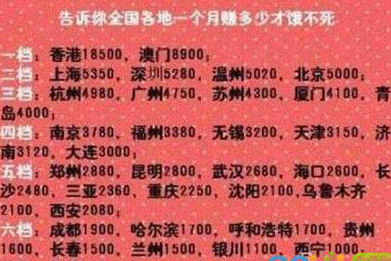“你一個月賺多少錢才餓不死?”面對漲薪、加班、亞健康等“職場PM2.5”,不少80后、90后求職者揮起了跳槽的旗幟。近日,網(wǎng)絡(luò)流傳一份全國各個省份的工資水平名單,鄭州以月薪2880元位居第五檔,在中部幾個省份屬于偏高階層。